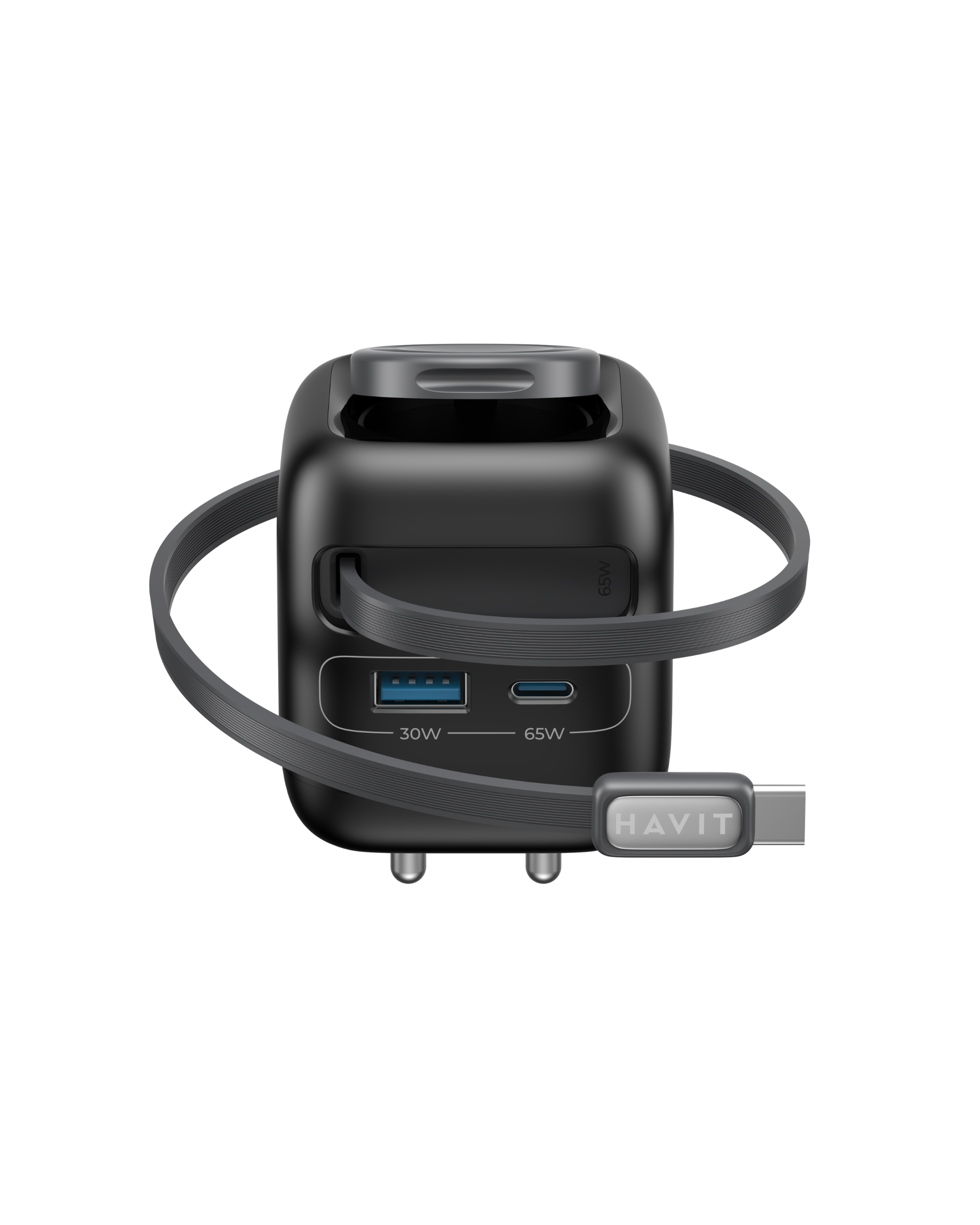 Power up your devices quickly and safely with the Havit 65W Dual Port Wall Charger. It features one USB-A port delivering up to 30W and one USB-C port with a powerful 65W output, supporting fast charging for laptops, smartphones, tablets, and more. Its compact design with foldable prongs is ideal for home, office, or travel.